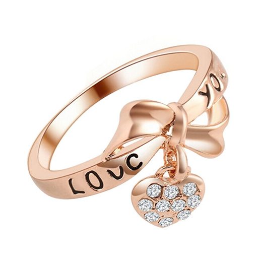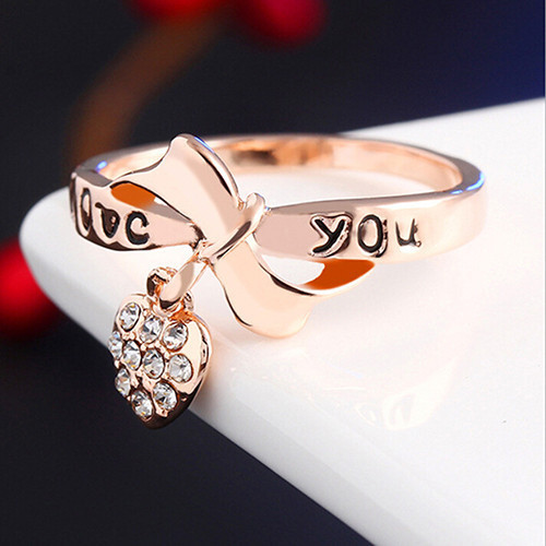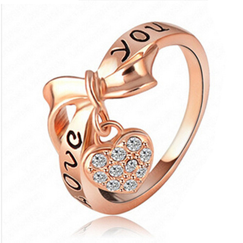 18k rózsa aranyozott gyűrű LOVE, szivecskés fityegő mintás CZ kristály gyűrű Valentin napra!
