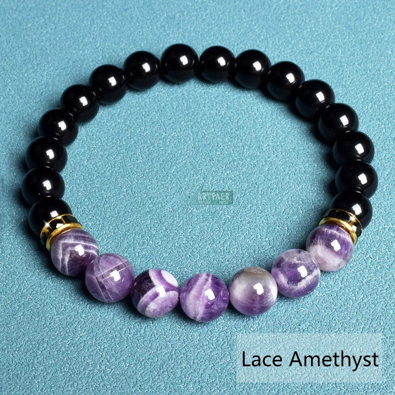 Ásvány karkötő fekete ónix és csíkos ametiszt - aranyozott vagy ezüstözött fekete kristályos fém köztes