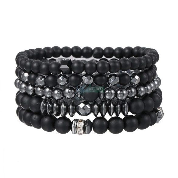 Ásvány karkötő matt fekete ónix és hematit - ezüstözött kristályos köztes 5 db-os szett