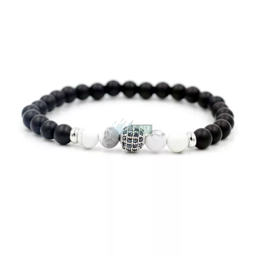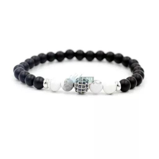 Ásvány karkötő matt fekete ónix és howlit - ezüstözött disco gömb CZ mikro kristályos charm