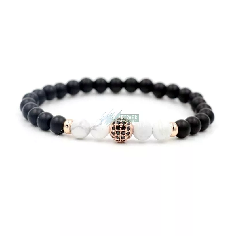 Ásvány karkötő matt fekete ónix és howlit - rózsa aranyozott disco gömb CZ mikro kristályos charm