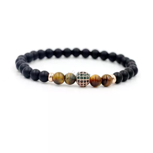 Ásvány karkötő matt fekete ónix és tigrisszem - rózsa aranyozott disco gömb CZ mikro kristályos charm