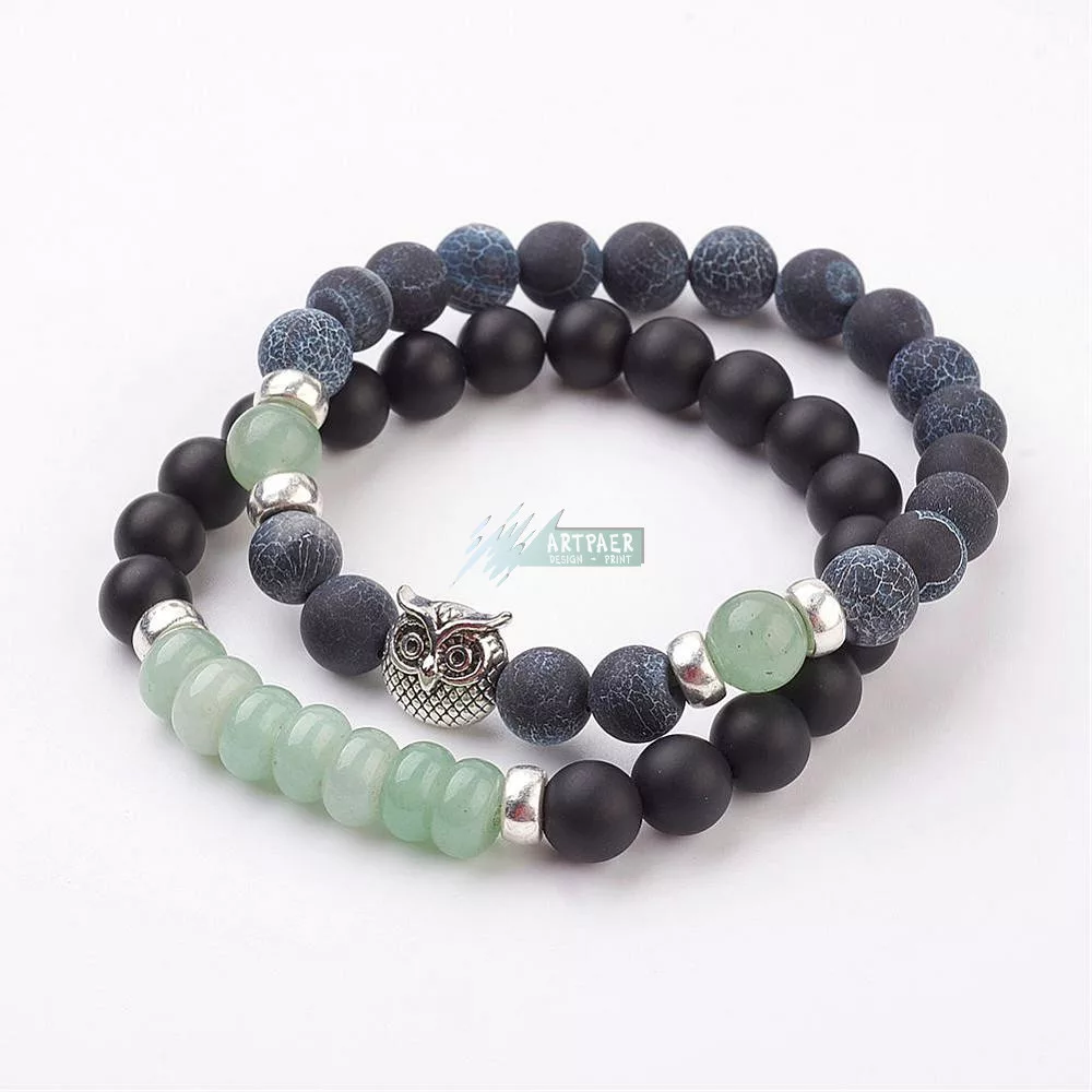 Bagoly - zöld aventurin - roppantott achát - matt óníx - páros ásvány karkötő - 2 db-os szett ajándék tasakkal
