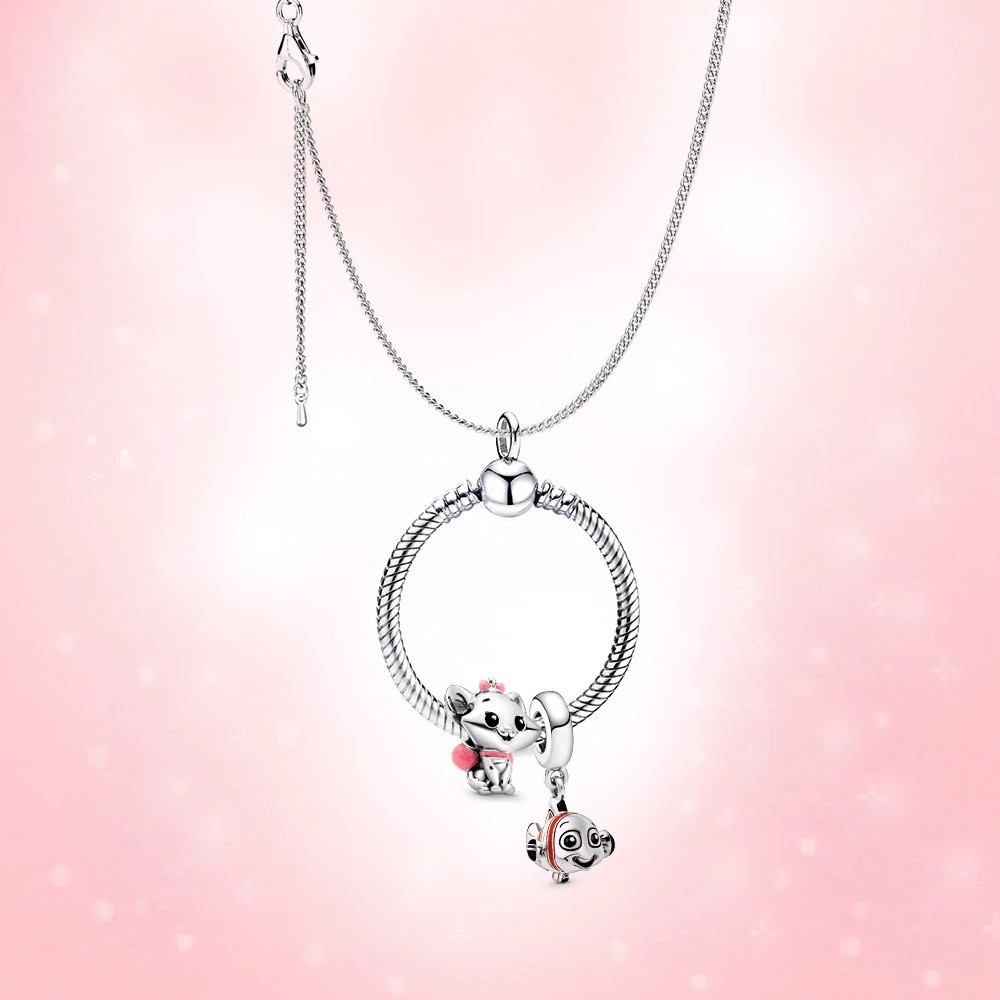 Ezüstözött nyaklánc pandora stílusú kicsi hősök Nemo és Marie charm-os medállal._x000D_ _x000D_ A medál átmérő: kb. 3 cm - pandora stílusban nyitható!_x000D_ _x000D_ A mérete kb:  45 cm.