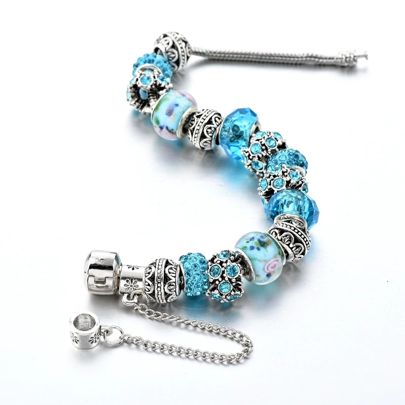 Ezüstözött tengerkék kristályos fém charm Pandora stílusú karkötő