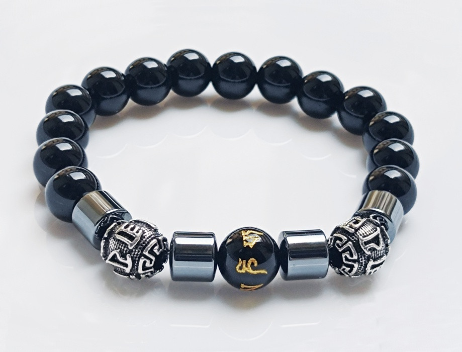 Ásvány karkötő Feng Shui obszidián és hematit - ezüstözött kínai vagyon és sok szerencsét charm