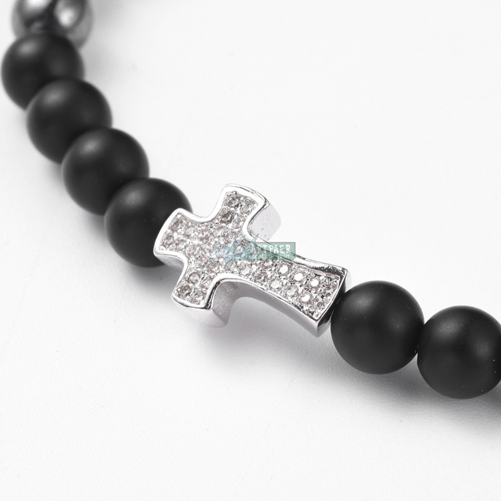 Hematit és matt fekete onix ezüst kereszt CZ mikro kristály charm ásvány karkötő