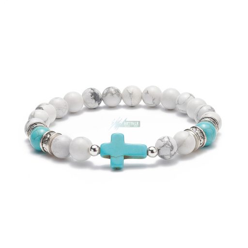 Howlit (magnesit), türkiz gyöngy és kereszt fém ötvozet köztes - ásvány karkötő