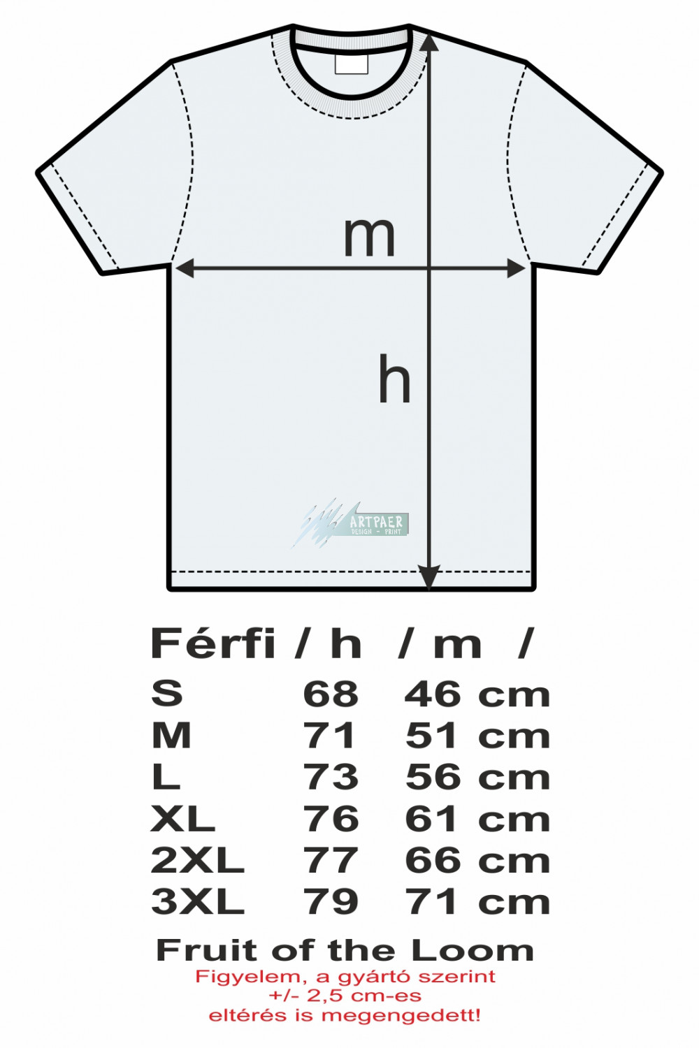 Férfi méretek S-3XL, Női méretek S-XXL, Gyerek méretek 92-152. 3XL-es póló csak fehér, fekete, szürke, oliva, királykék, sötétkék és piros színekben rendelhető.