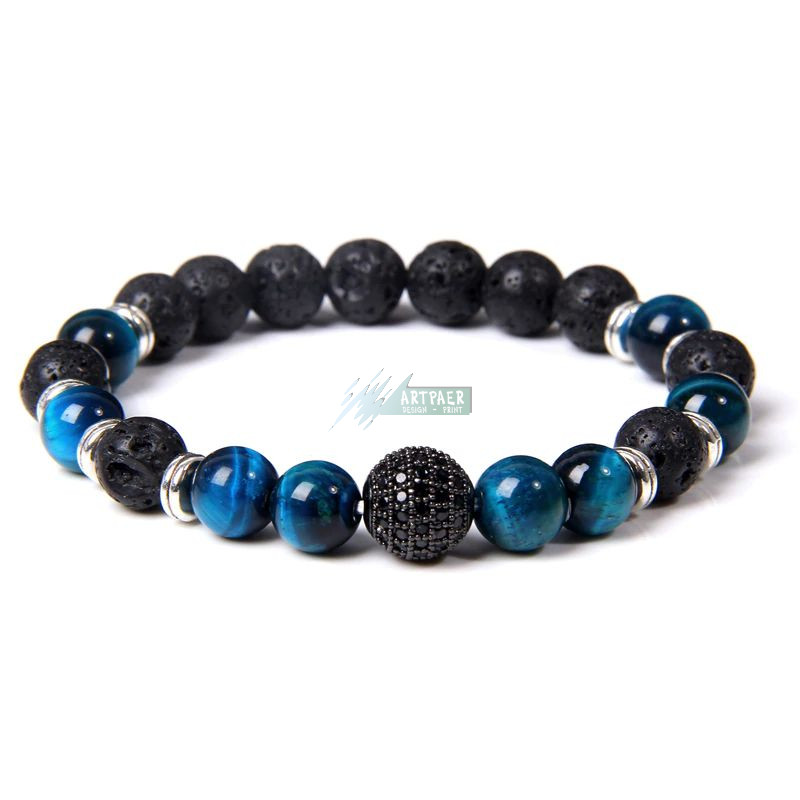 Kék tigrisszem - lávakő - fekete gömb cirkóniummal - ásvány karkötő