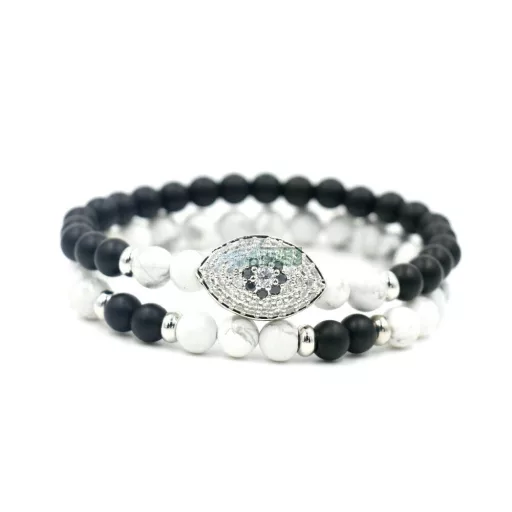 Mindent látó ezüst szemes ásvány karkötő páros szett Howlit - Onyx