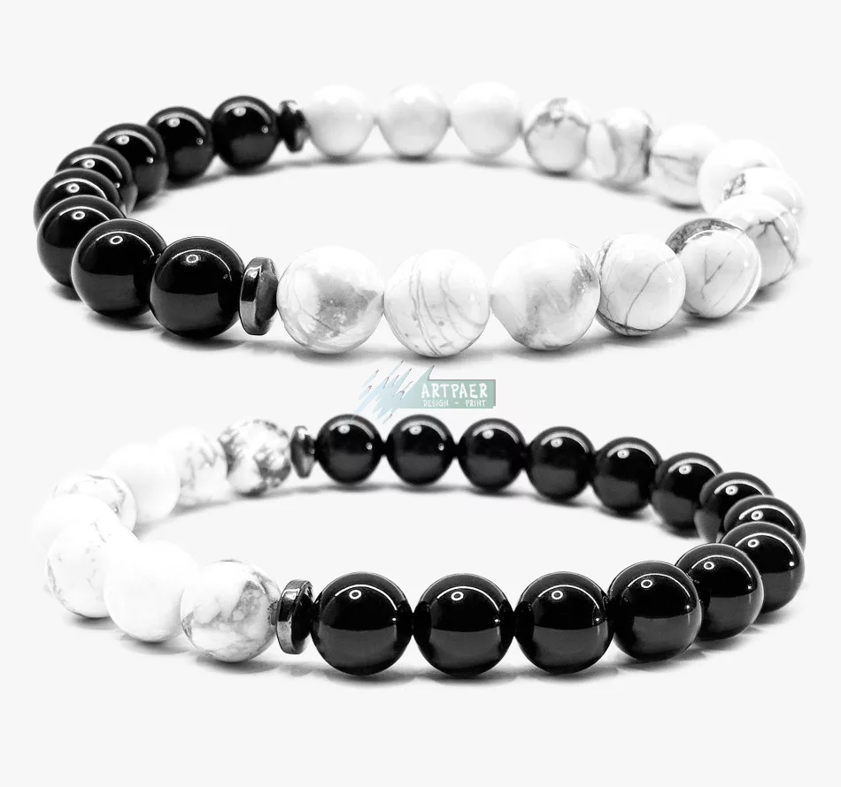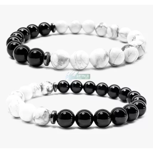 Ónix, hematit és howlit, páros ásvány karkötő, 2 db-os szett