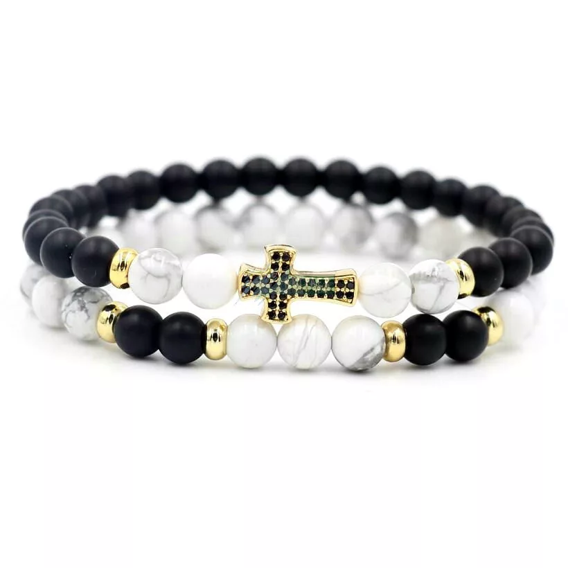 Páros ásvány karkötő matt fekete onix és howlit arany kereszt CZ mikro kristály charm 2 db-os szett