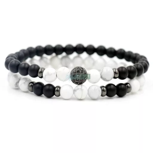 Páros ásvány karkötő matt fekete ónix és howlit - fekete disco gömb CZ mikro kristályos charm, 2 db-os szett