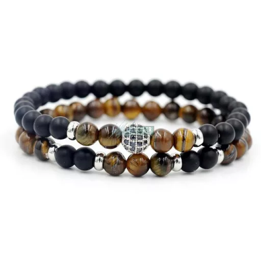 Páros ásvány karkötő matt fekete ónix és tigrisszem - ezüstözött disco gömb CZ mikro kristályos charm, 2 db-os szett
