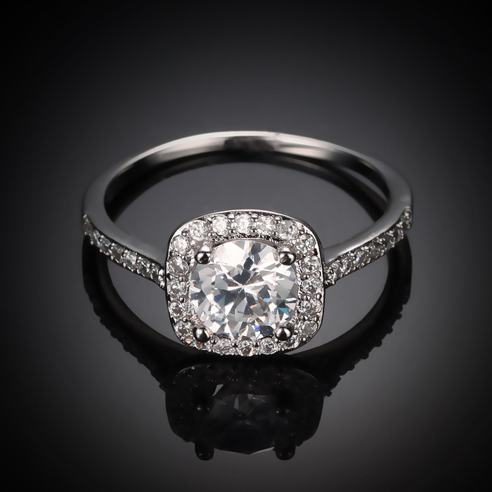 Platinummal futtatott, szikrázó üvegkristályokkal díszített gyűrű._x000D_ _x000D_ Középen egy nagyobb méretű, szépen csiszolt üvegkristály, körülötte négyzet alakban aprócska üvegkristályok díszítik az egyébként is szikrázó díszt._x000D_ _x000D_ A körgyűrű részén szintén aprócska kristályok fokozzák tovább a csillogást.