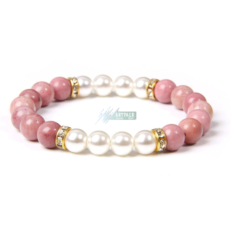 Rodonit - tenyésztett gyöngy - arany, kristályos köztes - ásvány karkötő