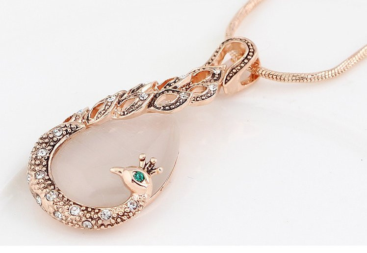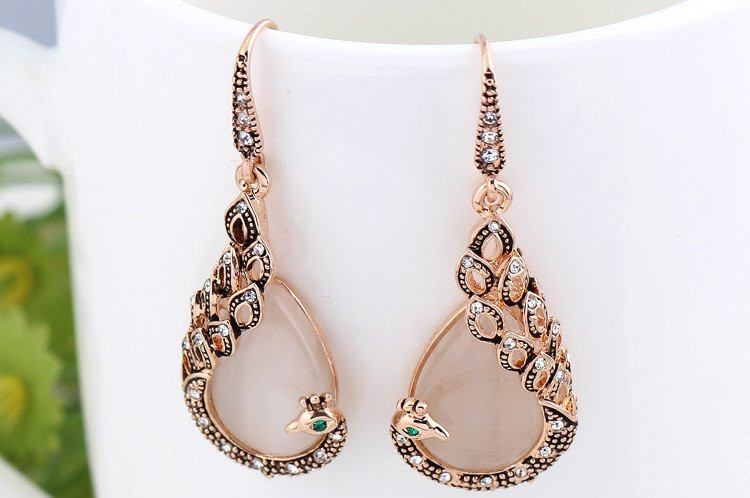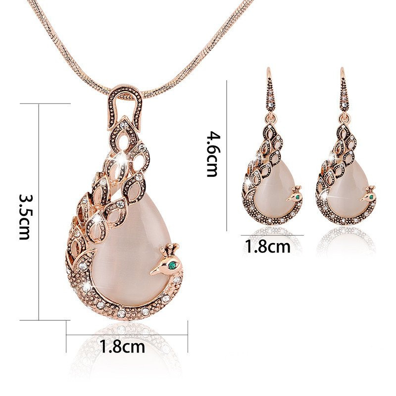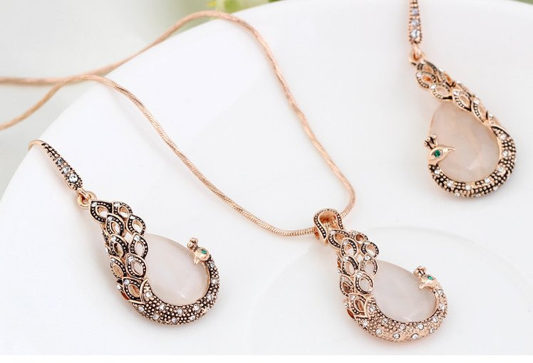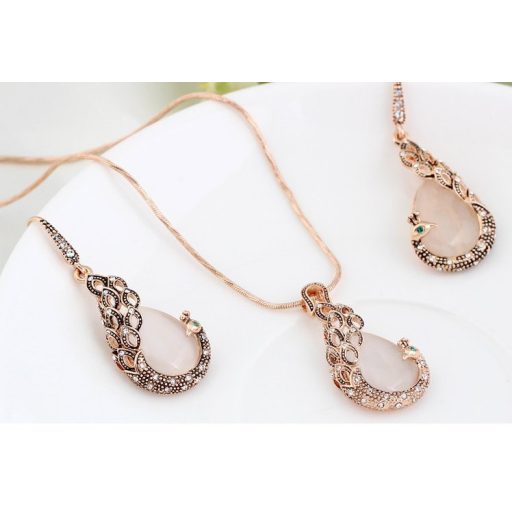 Rózsa aranyozott, antikolt, nyaklánc, opál és ausztria kristály páva medállal és fülbevalókkal - szett