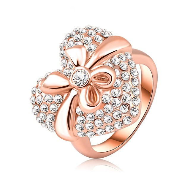 Rózsaaranyozott szív forma masnival átkötve mintás gyűrű cirkónium Austria kristály