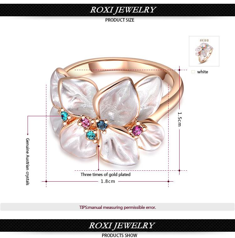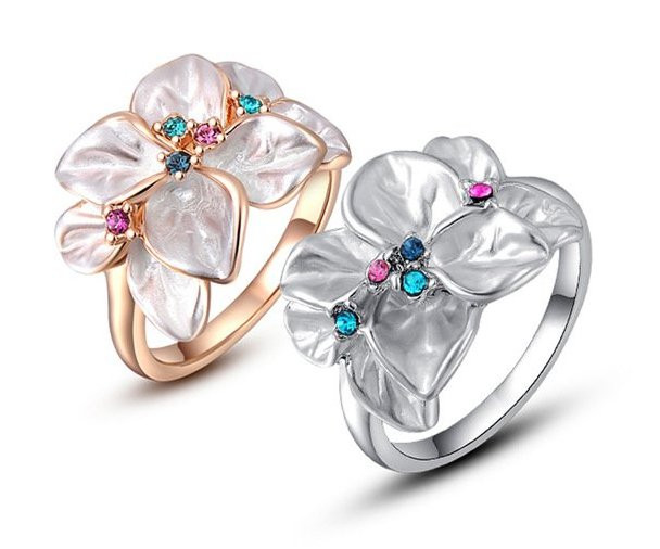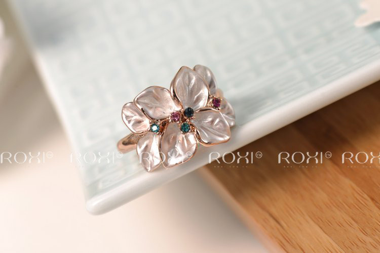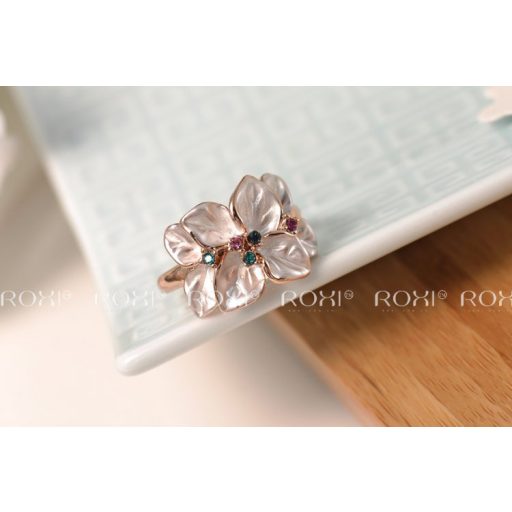 Rózsaarannyal futtatott virágforma gyűrű._x000D_ _x000D_ A virágszirmok selyemfényűek, amelyek közepében egy vagy több Austria kristály látható._x000D_ _x000D_ A kristályok magenta és türkiz színűek.