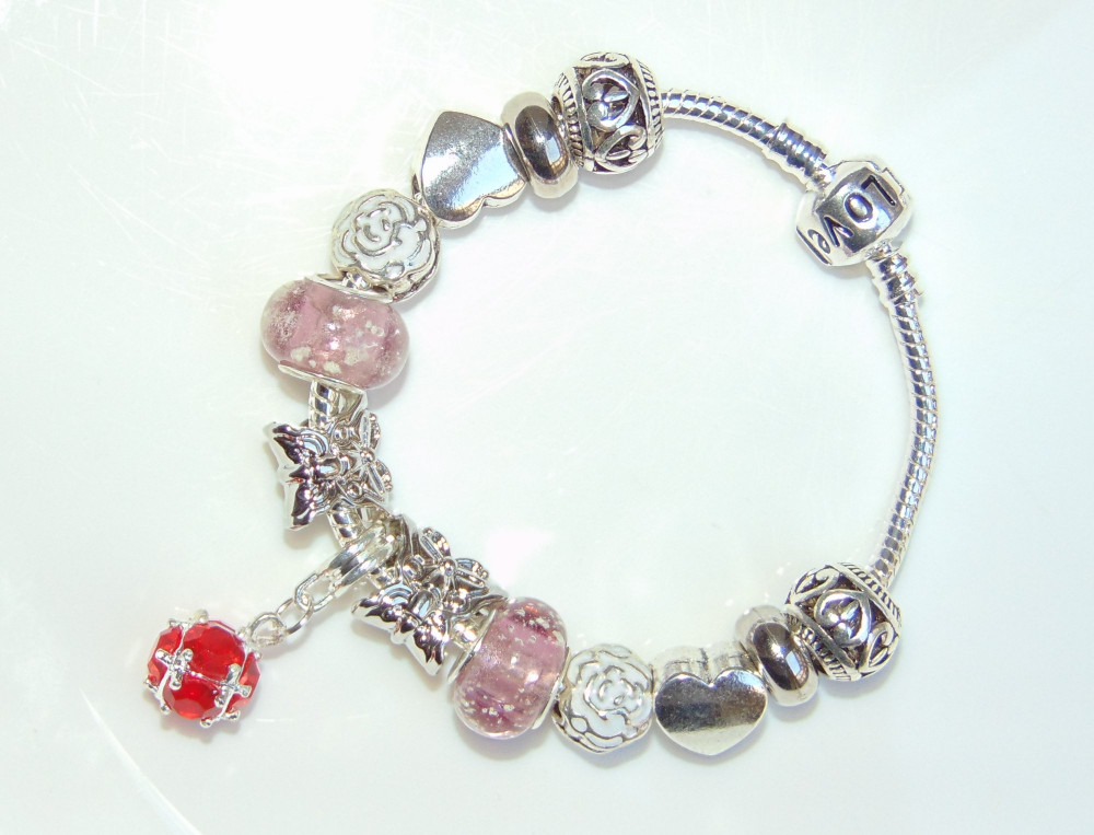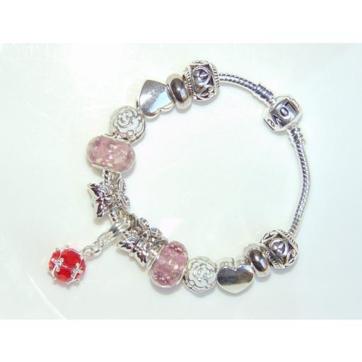 Rózsaszín foszforeszkáló üveg és fém charm Pandora stílusú karkötő