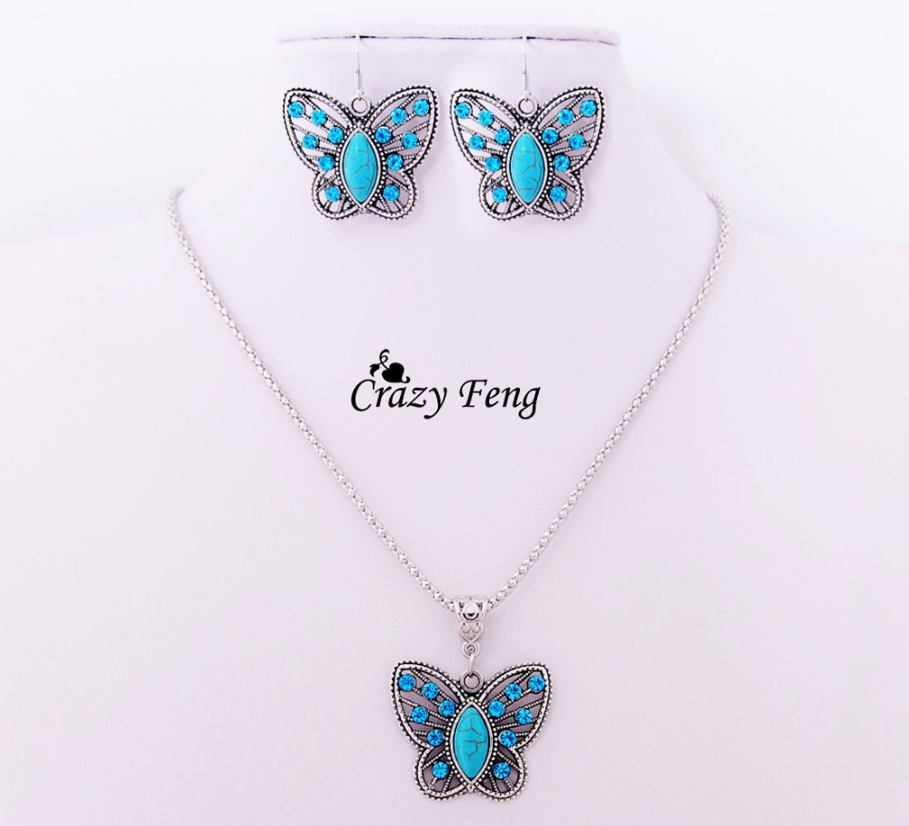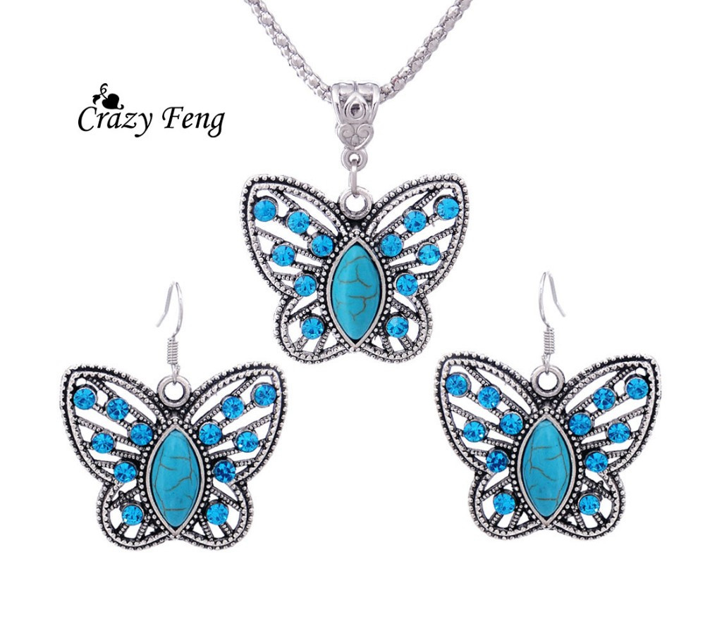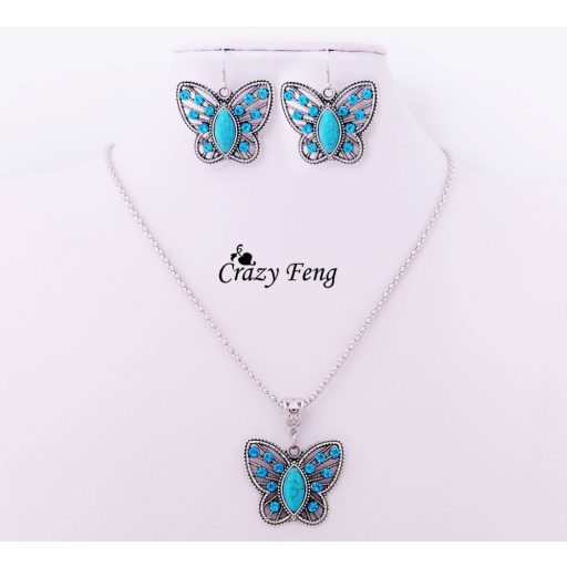 Antikolt, Ezüstözött, Fülbevaló, Nyaklánc, Pillangó, Szett, Szív, Türkiz