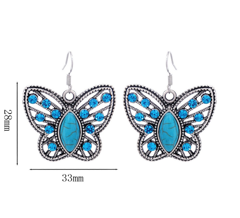 Kígyóbőr jellegű nyaklánc, antikolt ezüst és türkizzel mintázott pillangó medál és fülbevaló szett._x000D_ _x000D_ A pillangó teste türkiz berakásos kő. Kifeszített szárnyaiban aprócska türkiz színű kristályok csillognak._x000D_ _x000D_ A fülbevaló beakasztós jellegű._x000D_ _x000D_ A medál és a fülbevaló pillangója azonos méretű kb: 2,6 cm * 3,4 cm (a legszélesebb résznél)_x000D_ _x000D_