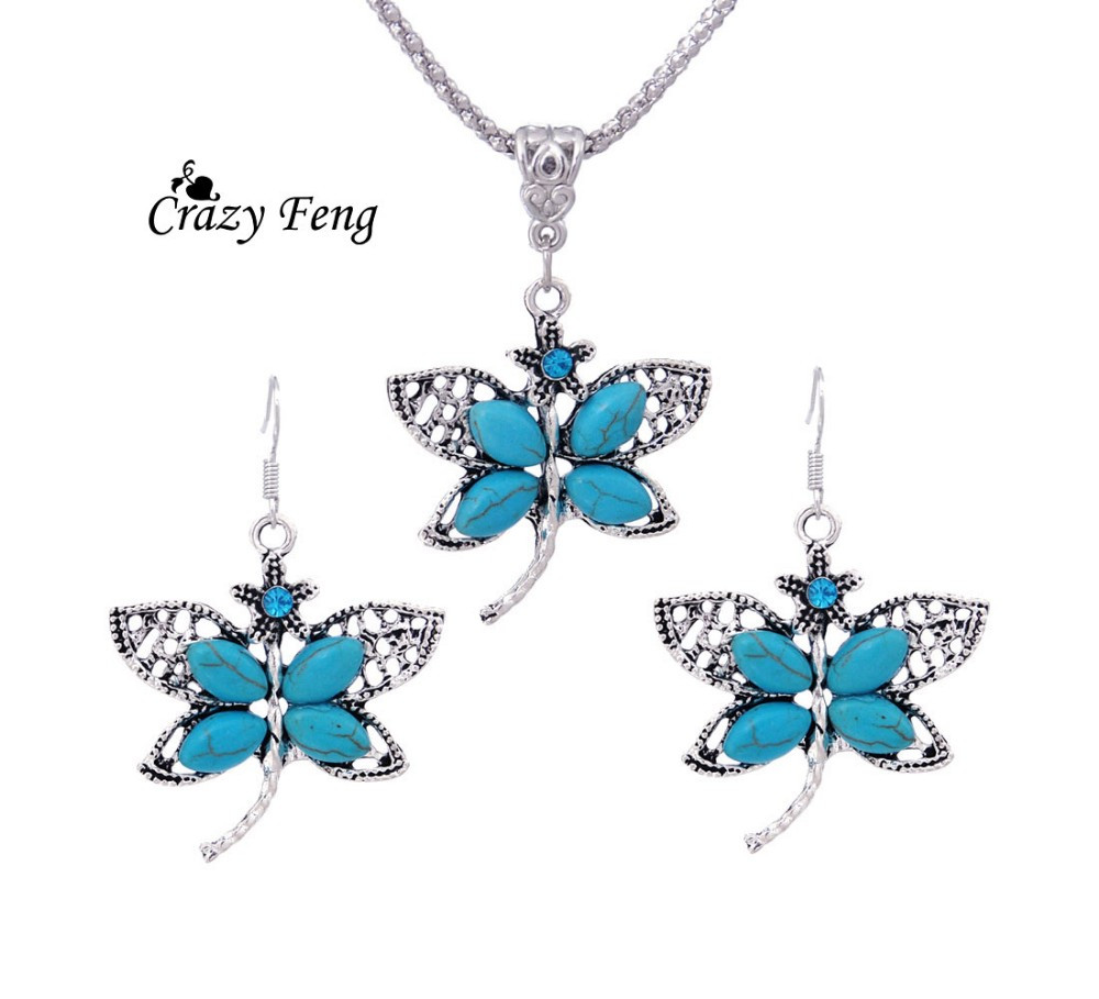 Kígyóbőr jellegű nyaklánc, antikolt ezüst és türkizzel mintázott szitakötő medál és fülbevaló szett