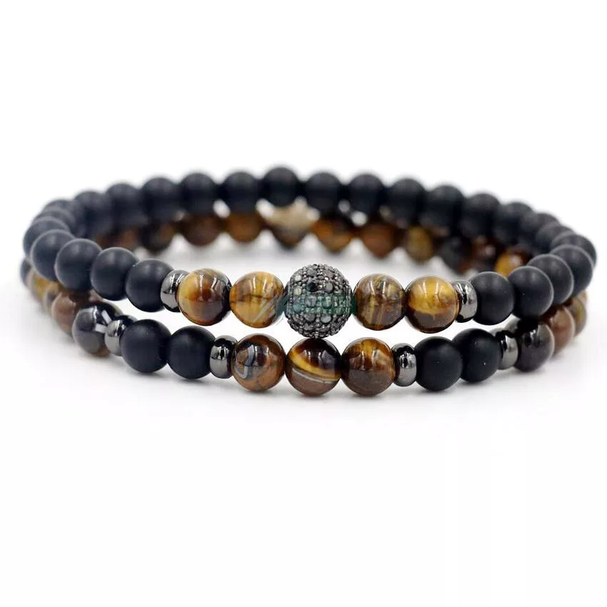 Páros ásvány karkötő matt fekete ónix és tigrisszem - fekete disco gömb CZ mikro kristályos charm, 2 db-os szett