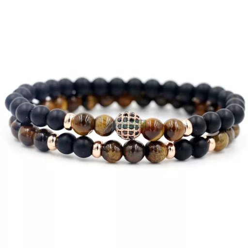 Páros ásvány karkötő matt fekete ónix és tigrisszem - rózsa aranyozott disco gömb CZ mikro kristályos charm, 2 db-os szett