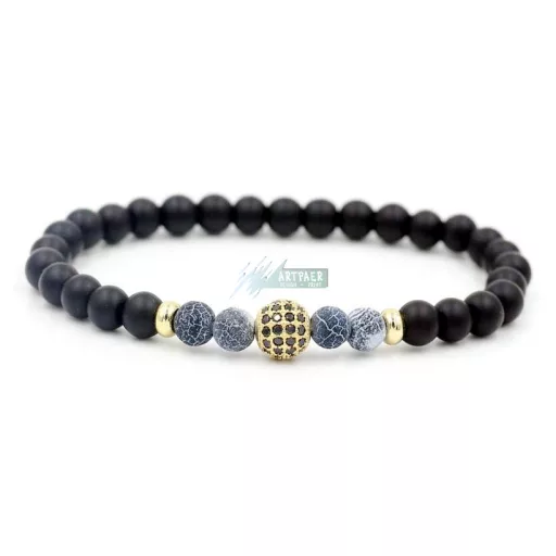 Ásvány karkötő matt fekete ónix és roppantott achát - aranyozott disco gömb CZ mikro kristályos charm