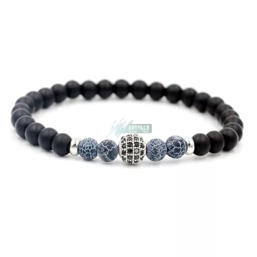 Ásvány karkötő matt fekete ónix és roppantott achát - ezüstözött disco gömb CZ mikro kristályos charm