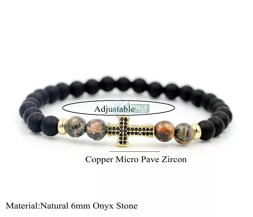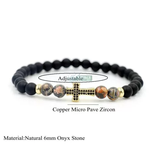 Ásvány karkötő matt fekete onix és leopárd jáspis arany kereszt CZ mikro kristály charm