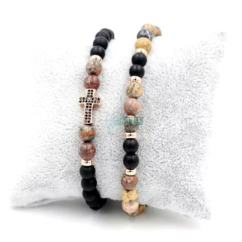 Páros ásvány karkötő matt fekete onix és leopárd jáspis rózsaarany kereszt CZ mikro kristály charm 2 db-os szett