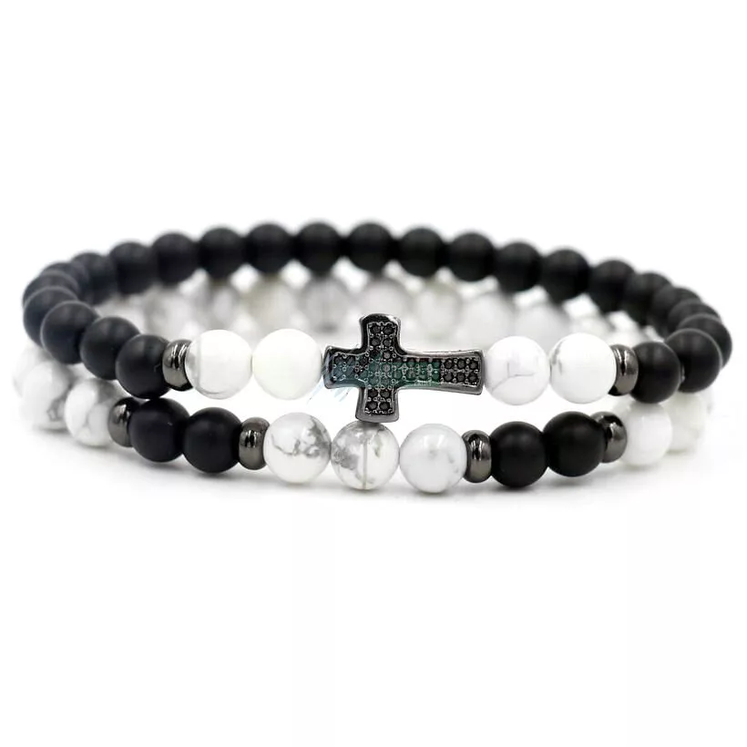 Páros ásvány karkötő matt fekete onix és howlit fekete kereszt CZ mikro kristály charm 2 db-os szett