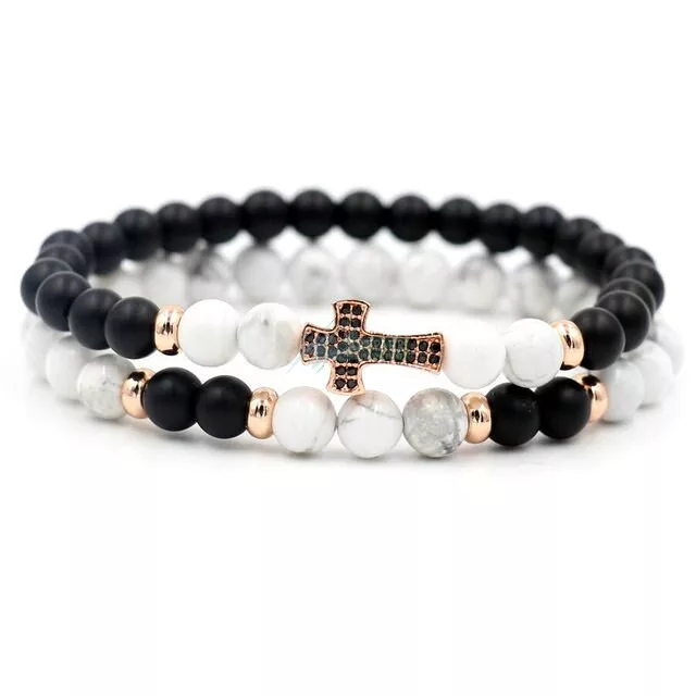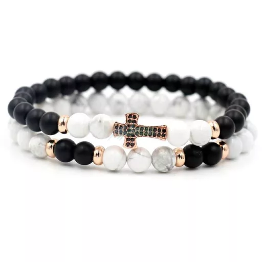 Páros ásvány karkötő matt fekete onix és howlit rózsaarany kereszt CZ mikro kristály charm 2 db-os szett