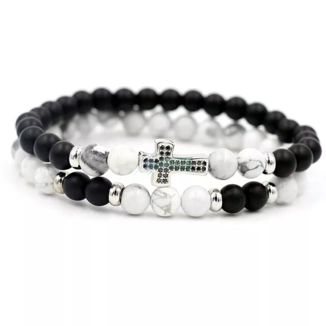 Páros ásvány karkötő matt fekete onix és howlit ezüst kereszt CZ mikro kristály charm 2 db-os szett